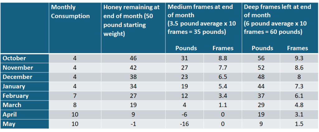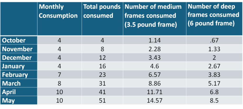 Honey consumption will vary based on colony size, insulation value of the hive, and ambient temperature over the winter.